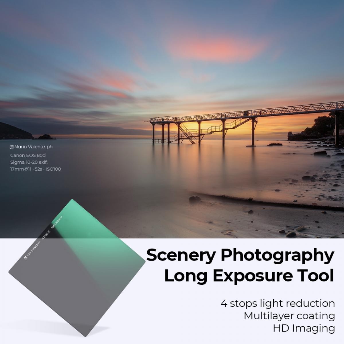 K&F Concept 100×100×2 mm Nano-X ND16 kvadratni filter zagotavlja visokokakovostno 4-stopinjsko zmanjšanje svetlobe za bolj gladke dolge osvetlitve in izboljšano nadzorovanje slike v svetlih okoljih. Izdelan je iz vrhunskega optičnega stekla AGC z dvostranskim 28-slojnim nano premazom, ki zmanjšuje odsevanje, je odporen na vodo, olje in praske ter zagotavlja ostre rezultate visoke ločljivosti – tudi pri uporabi teleobjektivov. Ta trpežen filter je idealen za fotografiranje pokrajin in zagotavlja čiste, uravnotežene osvetlitve s profesionalno jasnostjo.
