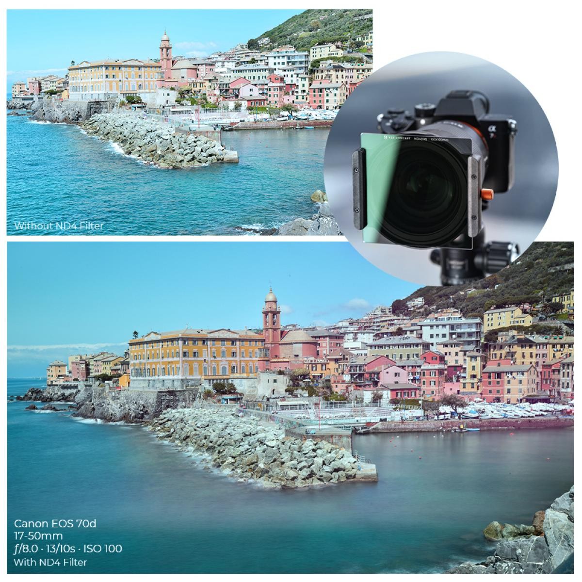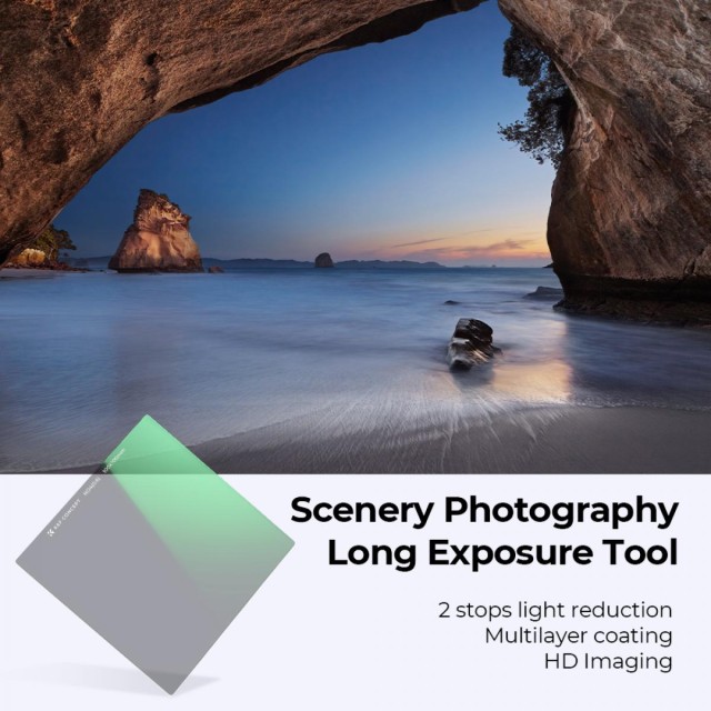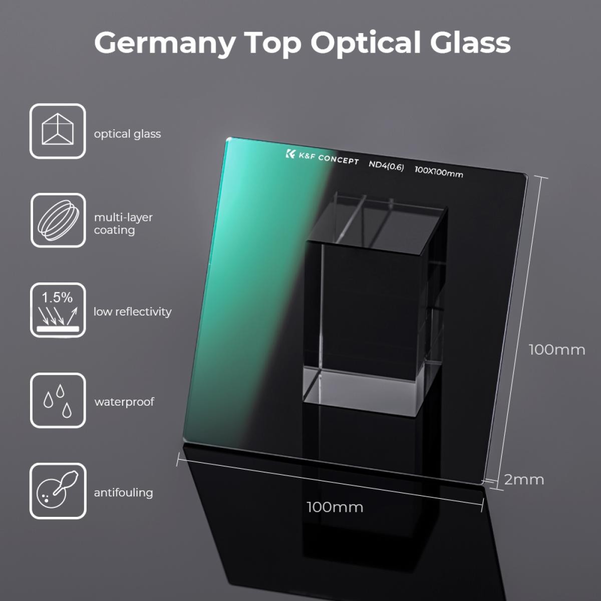 K&F Concept 100×100×2mm Nano-X Square Coated ND4 Filter je natančno izdelan nevtralni filter, zasnovan za fotografiranje z dolgimi ekspozicijami in visoko ločljivostjo. Izdelan je iz vrhunskega optičnega stekla AGC z dvostranskim 28-slojnim nano premazom, ki zmanjšuje bleščanje in odsevanje, hkrati pa ohranja ostrino pri vseh goriščnih razdaljah. Njegova trpežna, vodotesna, odporna na praske in olje površina zagotavlja zanesljivo delovanje v zahtevnih okoljih, priloženo zaščitno usnjeno in gobasto etui pa filter varuje med prevozom.