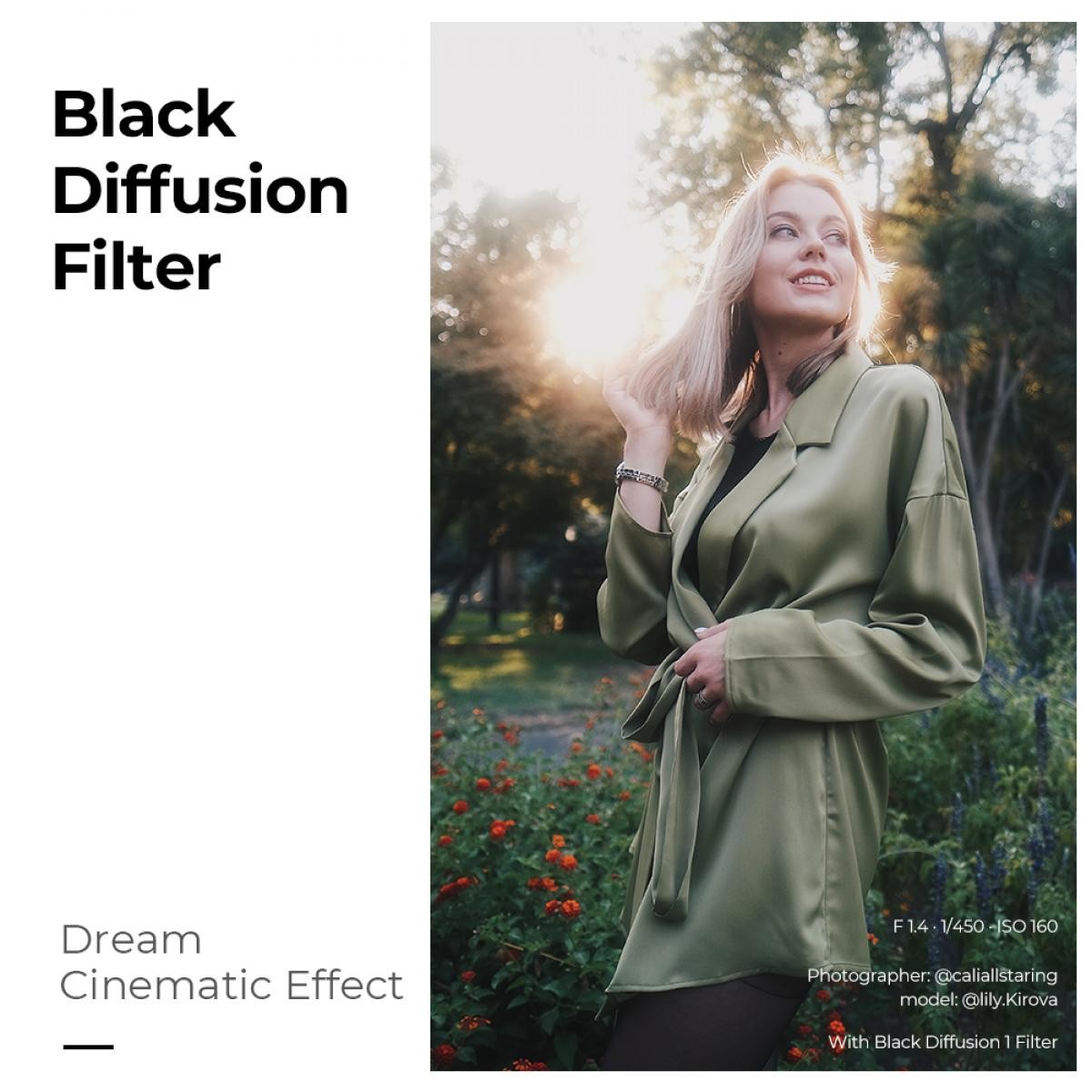 K&F Concept 100×100×2mm Black Mist 1/1 kvadratni filter je zasnovan za filmarje in fotografe, ki iščejo sanjski, atmosferični vizualni stil. Njegov močan difuzijski učinek zmehča gube, pege, pore in ostre podrobnosti, kožo naredi bolj privlačno, hkrati pa poudari svetlobne poudarke za kinematografski videz. Filter Black Mist 1/1 je idealen za portrete, vizualne pripovedi in ustvarjalne video scene, saj izboljša vzdušje, ne da bi pri tem žrtvoval ostrino slike.