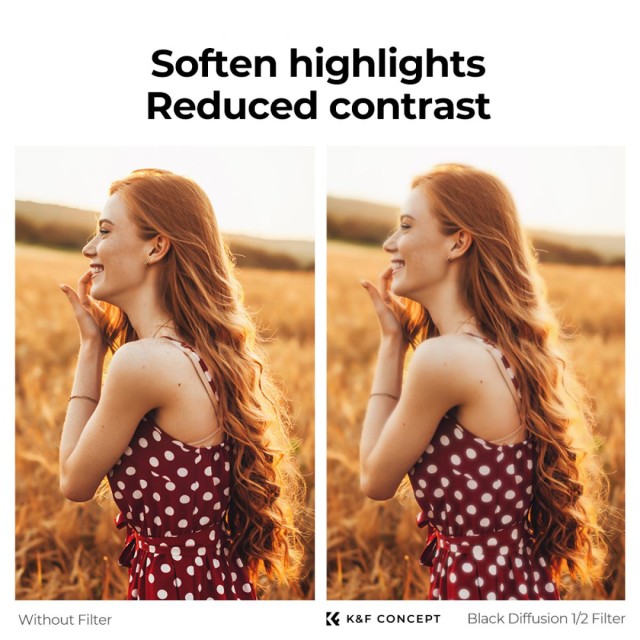 K&F Concept 100×100 mm črn megleni 1/2 kvadratni filter ustvarja mehak, sanjski kinematografski videz z nežnim razprševanjem svetlobnih poudarkov in izravnavanjem tonov kože. Izdelan je iz visokokakovostnega optičnega stekla AGC z naprednimi večplastnimi premazi in je idealen za portretno fotografijo in produkcijo videov.