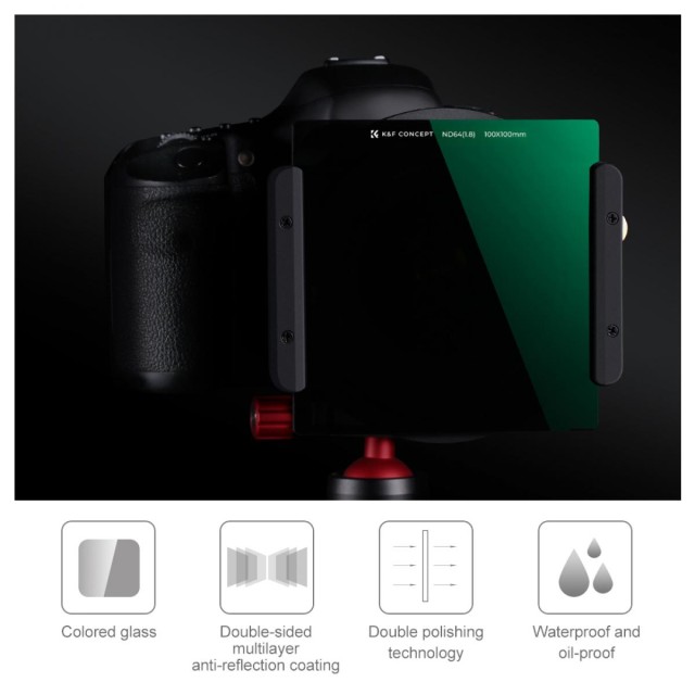 K&F Concept 100×100×2 mm kvadratni filter Full ND64 zagotavlja 6-stopinjsko zmanjšanje svetlobe za gladke dolge osvetlitve, bogato barvno natančnost in uravnoteženo fotografiranje pri dnevni svetlobi. Izdelan je iz vrhunskega japonskega optičnega stekla z 20-slojnim večplastnim odpornih premazom, ki zmanjšuje bleščanje, podvajanje slike in odsevanje, hkrati pa zagotavlja trajno zaščito pred praskami, vodo, oljem in prahom. Filter ND64, zasnovan za profesionalce, zagotavlja resnično nevtralno barvno zmogljivost brez IR-onesnaženja in je primeren za standardne 100-milimetrske kvadratne nosilce filtrov, vključno s serijo Cokin Z.