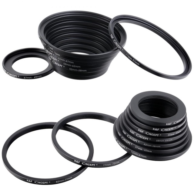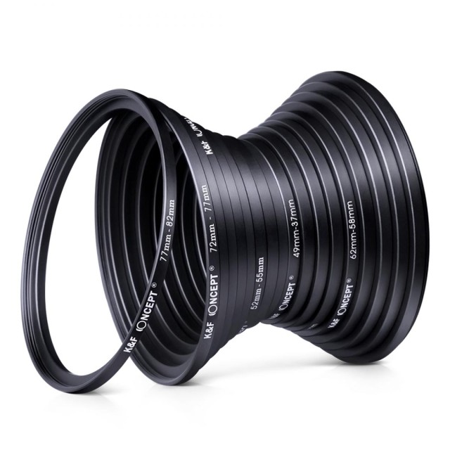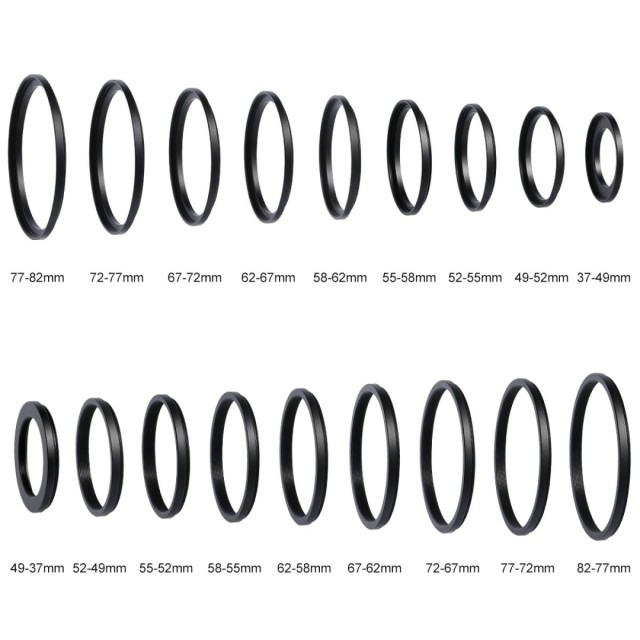18 v 1 adapter za obroč filtra za objektiv v enem kompletu. Vključuje komplet obročnih adapterjev za filtre Step Up (37-49, 49-52, 52-55, 55-58, 58-62, 62-67, 67-72, 72-77, 77-82 mm). Vključuje komplet obročastih nastavkov za adapter za filtre Step Up (49-37, 52-49, 58-55, 55-52, 62-58, 67-62, 72-67, 77-72, 82-77 mm).