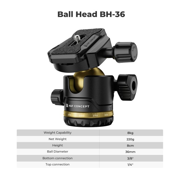 Napredna zasnova kroglične glave: 36 mm velika kroglična glava zagotavlja stabilnost, z novo zasnovo blaženja brez olja pa gladke in natančne premike fotoaparata. 360-stopinjska vodoravna lestvica na dnu glave olajša panoramsko fotografiranje in zagotavlja bolj osupljive rezultate kot ultraširokokotni objektiv. Kroglasta glava lahko vzdrži do 8 kg.