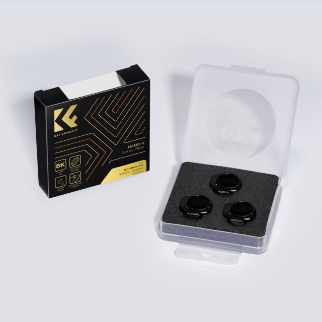 DJI Mini 4 Pro Hybrid ND&PL Filter Kit. Ta najnovejši hibridni filter ND&PL podjetja K&F Concept je posebej zasnovan za DJI Mini 4 Pro, en filter ima funkcije ND in CPL filtra, s čimer lahko ne le nadzoruje količino svetlobe, ki vstopa v objektiv, da zatemni nebo, temveč tudi prepreči neželene odseve, ki prihajajo od nekovinskih materialov, kot so voda, steklo itd., ter prispeva k povečanju kontrasta in nasičenosti na modrem nebu in belih oblakih.