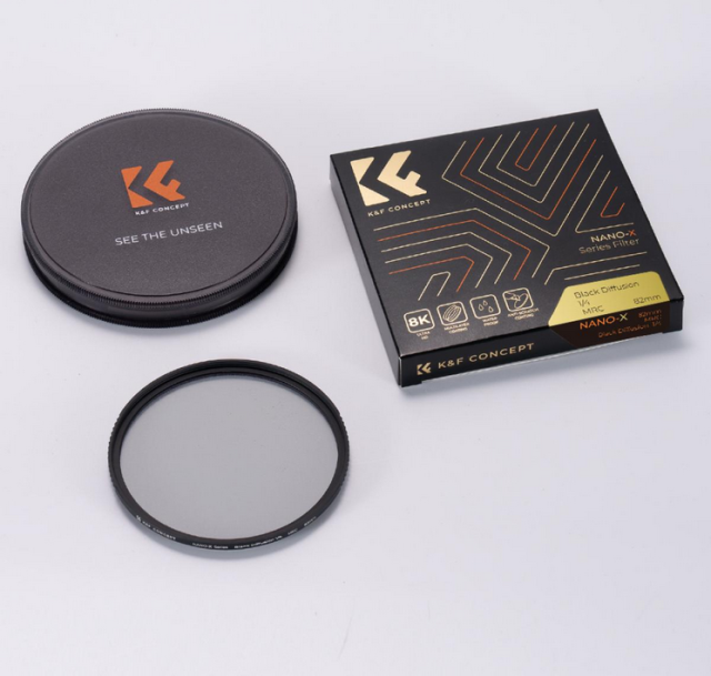 Filter K&F 46 mm Nano-X Black Mist Filter 1/4 zmehča obrazne poteze za filmski, sanjski učinek, idealen za portretno fotografijo in videografijo. Narejen je iz optičnega stekla AGC z 28 večplastnimi prevlekami, zagotavlja vrhunsko jasnost slike, je vodoodporen in odporen na praske ter ima izjemno tanek okvir, ki preprečuje vinjetiranje.