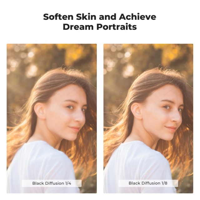 Filter K&F Concept Black Diffusion Mist lahko zmehča svetlobne odseve, zmanjša kontrast in ustvari filmski učinek za videoposnetke in fotografije.