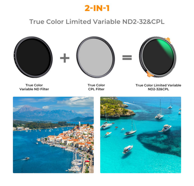 Večnamenski filter K&F 52MM True Color ND2~32+CPL združuje funkciji ND in CPL v enem vsestranskem filtru. Nadzoruje vnos svetlobe od ND2 do ND32, hkrati pa odpravlja neželene odseve in izboljšuje barvni kontrast, zato je idealen za različne pogoje fotografiranja.