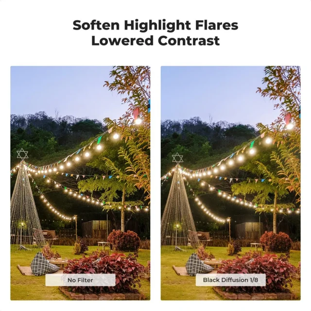 Črni difuzijski filter K&F Concept 1/8 omogoča mehko svetlobo na fotografijah ali videoposnetkih in nadzira odboje svetlobe, zaradi česar je koža bolj nežna, pore pa manj vidne, tehnologija dvojnega poliranja pa zagotavlja visoko ločljivost v goriščni razdalji 550 mm. Črni difuzijski filter 1/8 Izdelan iz visokoprecisnega optičnega stekla japonske družbe AGC, večplastni premaz za dodatno prosojnost do 87 % prepustnosti, učinkovito zmanjša odboje svetlobe, ki prihajajo iz samega filtra.