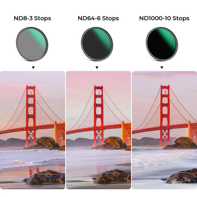 Izboljšajte svoje fotografije s profesionalnim kompletom filtrov za objektive K&F 52MM, ki vsebuje fiksne ND-filtre ND8, ND64 in ND1000, izdelane iz visokokakovostnega japonskega optičnega stekla z 24-slojnim nano premazom, ter vodotesno torbico in tri krpe za čiščenje.