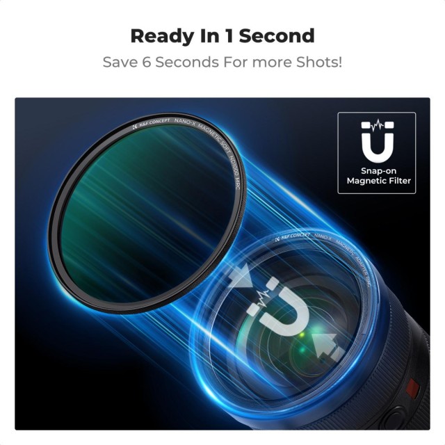 Komplet 5-delnih magnetnih filtrov K&F Concept 55 mm vključuje filtre GND8, ND8, ND64 in ND1000 ter magnetni adapter, ki omogoča izjemno hitro menjavanje v 1 sekundi, vrhunsko večplastno optično steklo in izjemno tanek dizajn brez vinjetiranja, ki je idealen za fotografiranje pokrajin in fotografiranje z dolgimi ekspozicijami.