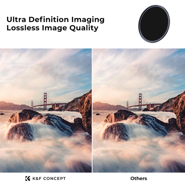 Filter ND (filter nevtralne gostote) je namenjen preprečevanju pretirane osvetlitve pri fotografiranju na prostem, nadzoru svetlobe, ki vstopa v objektiv, tudi pri nizkem času zaklopa, da se zabeleži zamegljeno gibanje predmeta, in priporoča uporabo pri fotografiranju pokrajine. Komplet filtrov ND vključuje filter ND4+ND8+ND64+ND1000 (vsak po 1 kos) in 1 torbico za filter.