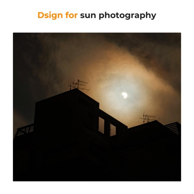 K&F Concept ND10000000000 Solar Filter je filter nevtralne gostote z zmanjšanjem svetlobe za 20 stopinj, ki se večinoma uporablja za fotografiranje sonca in dolge osvetlitve. Z natančnim zmanjšanjem svetlobe bo filter pomagal zagotoviti barvno zvestobo in ostre rezultate ter zajeti podrobnosti sonca. Ta trdni filter nevtralne gostote ND1000000 je izdelan iz visokokakovostnega optičnega stekla z 28-slojnim nanopremazom, ki pomaga učinkovito zmanjšati odboj na površini filtra in duhove, hkrati pa je filter odporen proti praskam, vodi, olju in prahu.