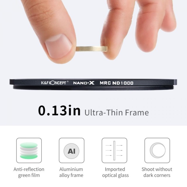 Filter K&F 55MM XN26 Nano-X Fixed ND1000 zagotavlja 10-stopinjsko zmanjšanje svetlobe za fotografiranje z dolgim časom osvetlitve, ohranja pristne barve z 28-slojnim protirefleksnim premazom, ultra tanek aluminijast okvir in trpežno vodotesno, olje in praske odporno konstrukcijo.