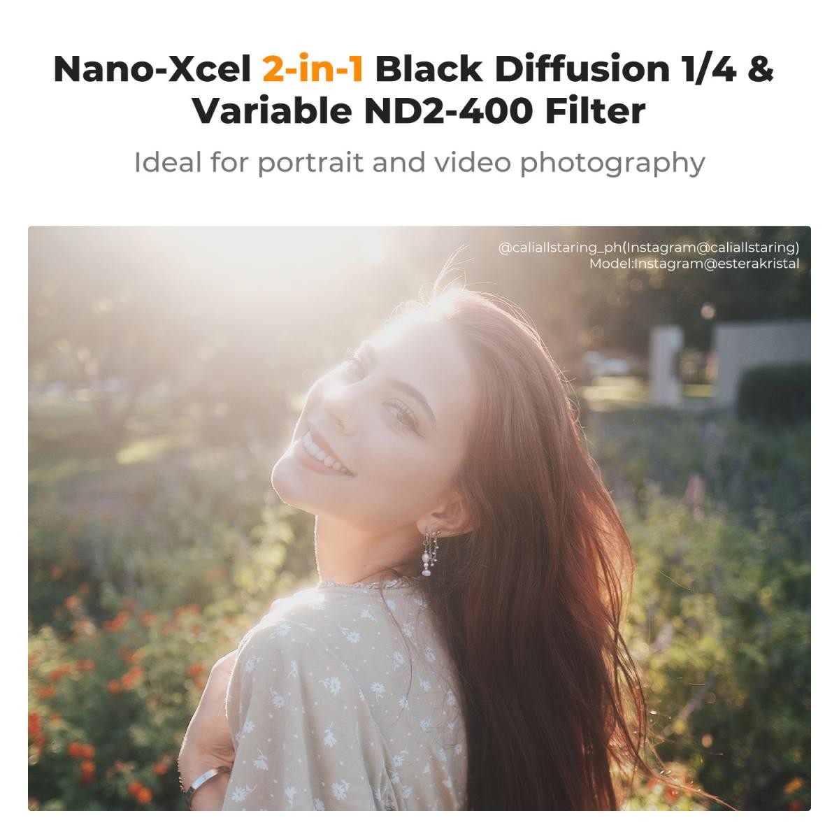 Filter K&F Concept 58 mm Adjustable Black Mist 1/4 & Variable ND2–ND400 združuje kinematografsko difuzijo z natančnim nadzorom osvetlitve in ponuja vsestransko rešitev 2 v 1 za fotografe in videografe, ki iščejo sanjske poudarke in gladko prilagajanje svetlobe.