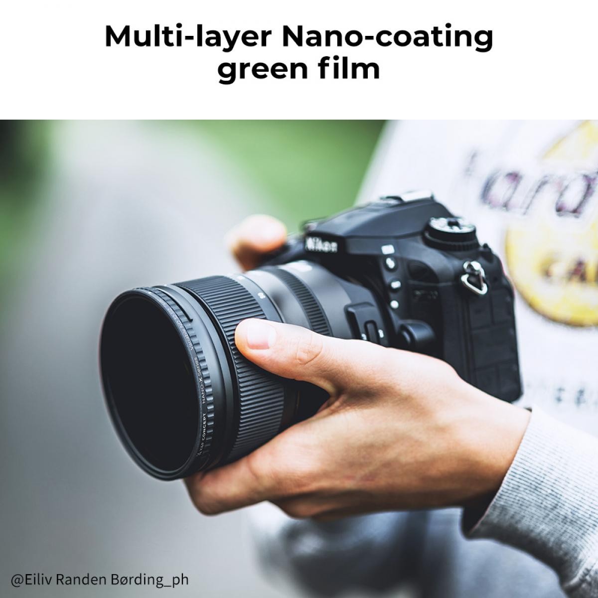 Filter je izdelan iz visokokakovostnega optičnega stekla, ohranja ostrino slike, zmanjšuje bleščanje in zagotavlja zanesljive HD rezultate. 28-slojni nano premaz zagotavlja vodoodporno, oljeodporno in odporno za praske zaščito, zaradi česar je filter trpežen in enostaven za vzdrževanje. Ultra tanek 7,6 mm okvir iz letalskega aluminija zmanjšuje vinjetiranje, tudi pri širokokotnih objektivih, medtem ko matirana površina pomaga zmanjšati razpršeno svetlobo za čistejše slike. Ta filter je idealno orodje za ustvarjalce, ki zahtevajo vsestranskost in zanesljivo delovanje.
