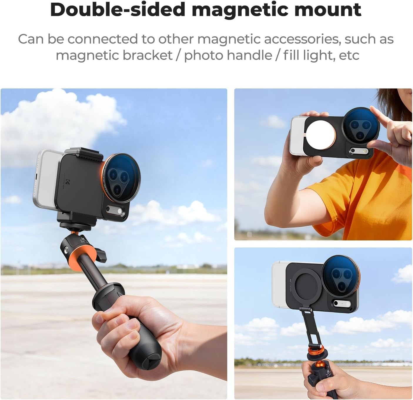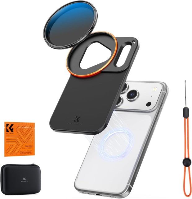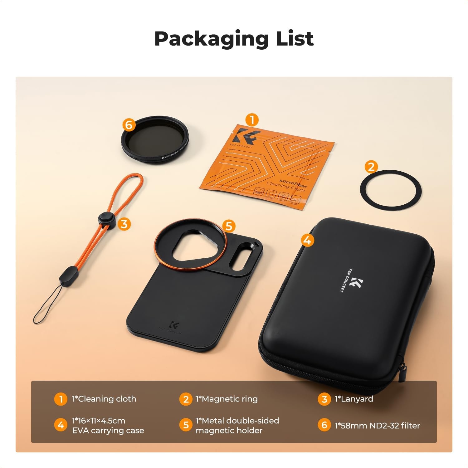 K&F 58 mm vijačni iPhone Magsafe dvostranski magnetni nosilec filtra za iPhone 17 Pro Max zagotavlja natančno prileganje, močne dvostranske magnete in podpira 58 mm filtre, vključno s priloženim VND filtrom. Zagotavlja stabilno, varno in vsestransko mobilno fotografijo s celovito zaščito in prenosnim shranjevanjem.
