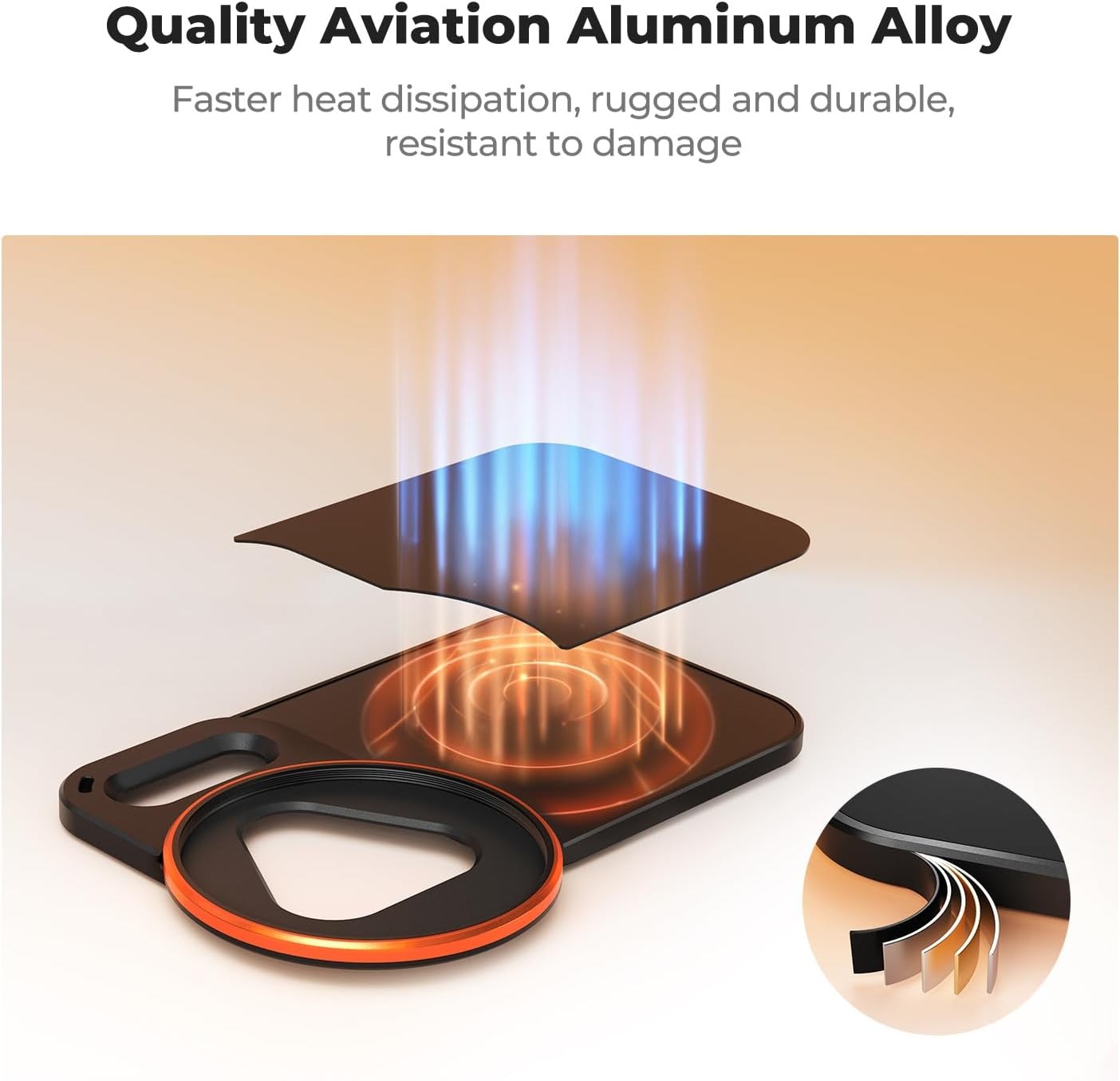 Za varnost in udobje ima nosilec protizdrsne silikonske blazinice, okvir, ki absorbira udarce, luknjo za vrvico in priloženo vrvico, ki preprečuje padce. Večnamenska matirana EVA torba za shranjevanje z mrežastimi žepi in elastičnimi trakovi ohranja magnetni nosilec in filtre organizirane in zaščitene, kompaktne dimenzije (16 × 11 × 4,5 cm) pa omogočajo enostavno prenašanje skupaj z drugimi dodatki. Optimalna zmogljivost je dosežena pri uporabi na goli iPhone; omejena uporaba z uradnimi ovitki Apple je podprta s priloženim magnetnim obročem.