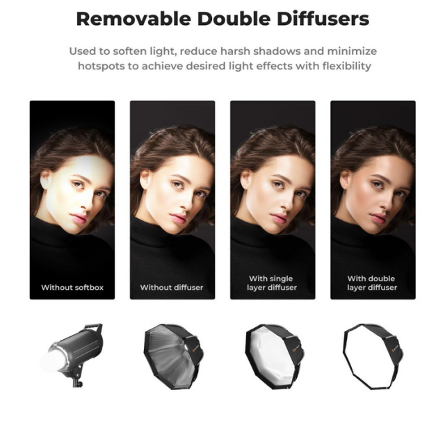 - Mreža iz satovja in difuzorji: Mreža satovja zgošča in nadzoruje smer svetlobe, s čimer obogati raven svetlobe in teme na posnetkih ter ustvarja dramatične in izrazite svetlobne učinke. Dva visokokakovostna difuzorja lahko uporabljate skupaj ali ločeno za ustvarjanje različnih slogov osvetlitve.