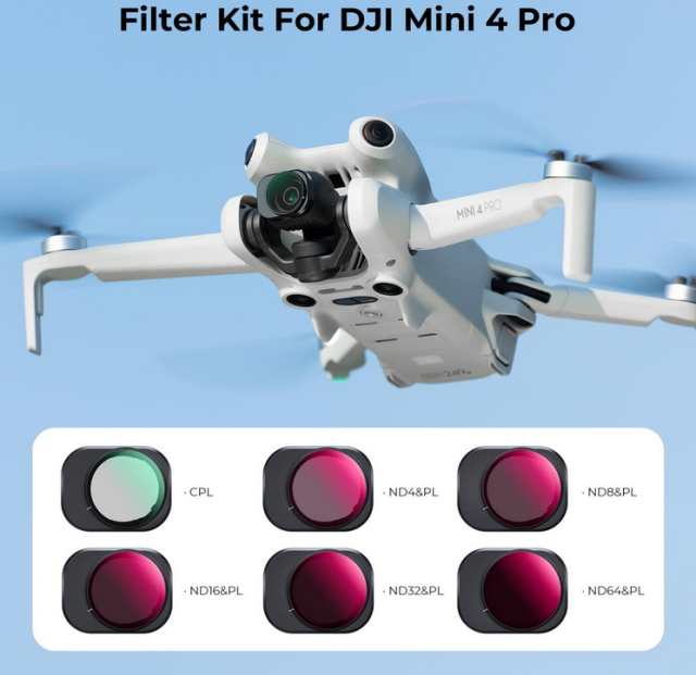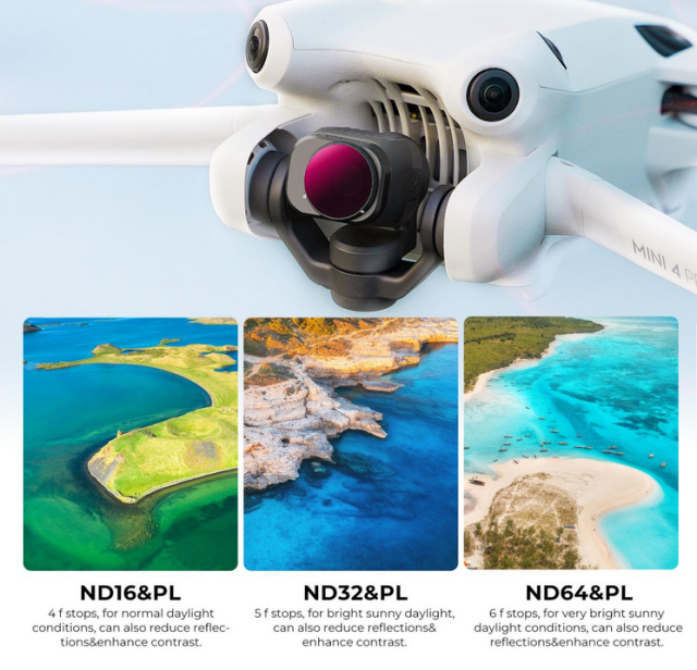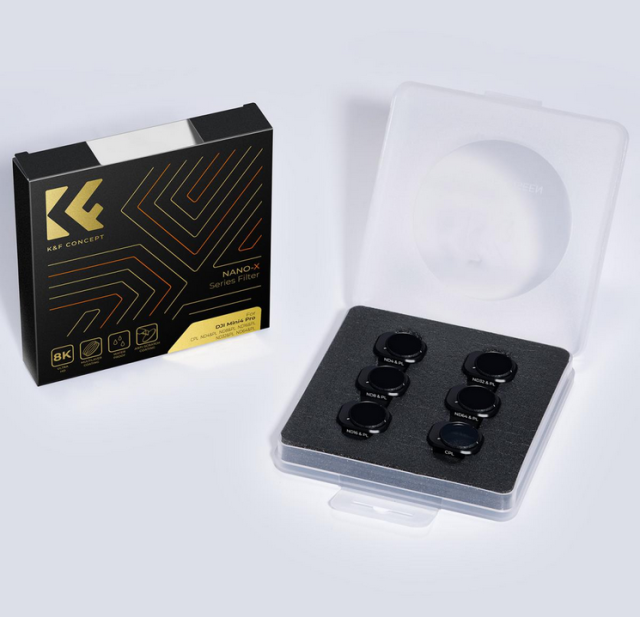 Komplet filtrov K&F 6 kosov za DJI Mini 4 Pro vključuje filtre CPL, ND4&PL, ND8&PL, ND16&PL, ND32&PL in ND64&PL, ki zagotavljajo celovit nadzor svetlobe in izboljšujejo kakovost slike. Ti filtri so izdelani iz vrhunskega optičnega stekla AGC z 28 plastmi nanopovlakov, zato zagotavljajo zanesljivo zaščito in jasnost visoke ločljivosti. Komplet združuje funkcije ND in CPL za zmanjšanje bleščanja, upravljanje svetlobe ter izboljšanje nasičenosti barv in kontrasta, ne da bi to vplivalo na kalibracijo in ravnotežje kardana.