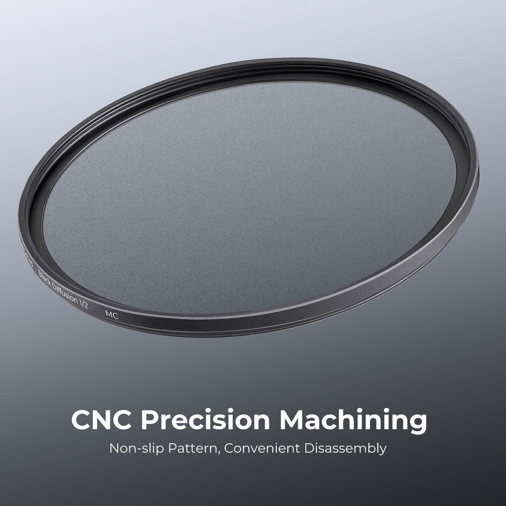 K&F Concept 72 mm C serija Black Mist Filter 1/2 zmehča svetlobne poudarke in ustvari kinematografski učinek mehkega sijaja. Ta ultra tanek krožni difuzijski filter iz serije Classic ima večplastni zeleni premaz in trpežen aluminijast obroč za profesionalne rezultate.