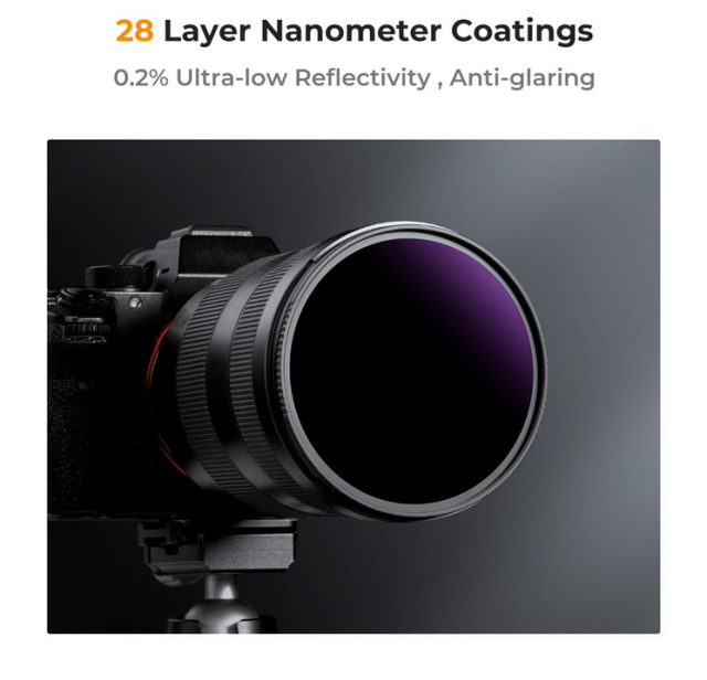 Filter K&F 72MM Nano-X Ultra ND1000000 je zasnovan za posebne fotografske potrebe, vključno s fotografiranjem sonca in daljšimi posnetki z dolgo osvetlitvijo. Ta filter ponuja impresivnih 20 stopenj zmanjšanja svetlobe, zato je idealen za zajemanje zapletenih podrobnosti sonca ali ustvarjanje dramatičnih učinkov zameglitve gibanja. Izdelan je iz visokokakovostnega optičnega stekla in ima 28-slojni nanopovlak, zato zagotavlja vrhunsko zaščito pred praskami, vodo, oljem in prahom, hkrati pa zmanjšuje odseve in duhove. Naguban obroč filtra zagotavlja varen oprijem, izjemno tanek in lahek aluminijast okvir pa pomaga preprečevati vinjetiranje. Združljiv je z vsemi objektivi z 72-milimetrskim sprednjim navojem.