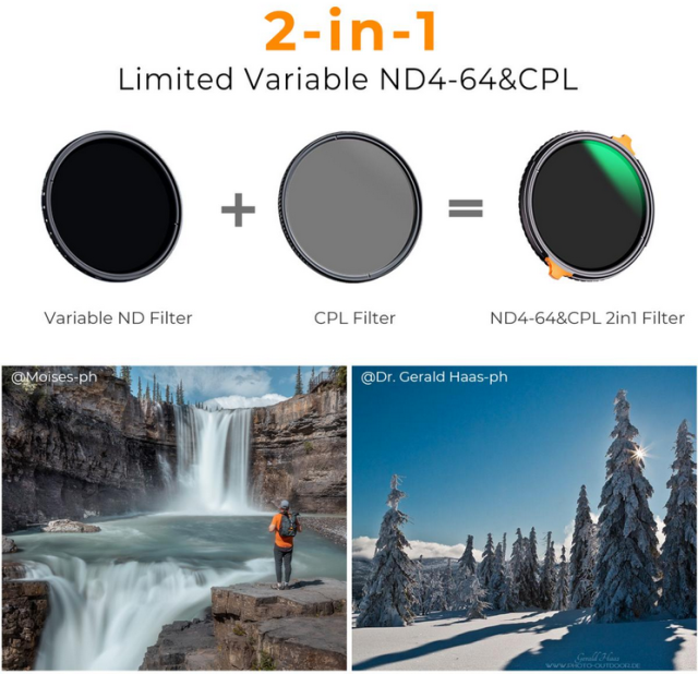 Filter K&F 72 mm ND4-ND64 Variable ND in CPL združuje prednosti filtra nevtralne gostote (2-6 stopenj) in krožnega polarizacijskega filtra v enem. Odličen je za prilagajanje izpostavljenosti svetlobi in odpravljanje bleščanja, izboljšuje barve in kontrast za osupljivo fotografijo pokrajine in videografijo brez tveganja neželenih križnih vzorcev "X".