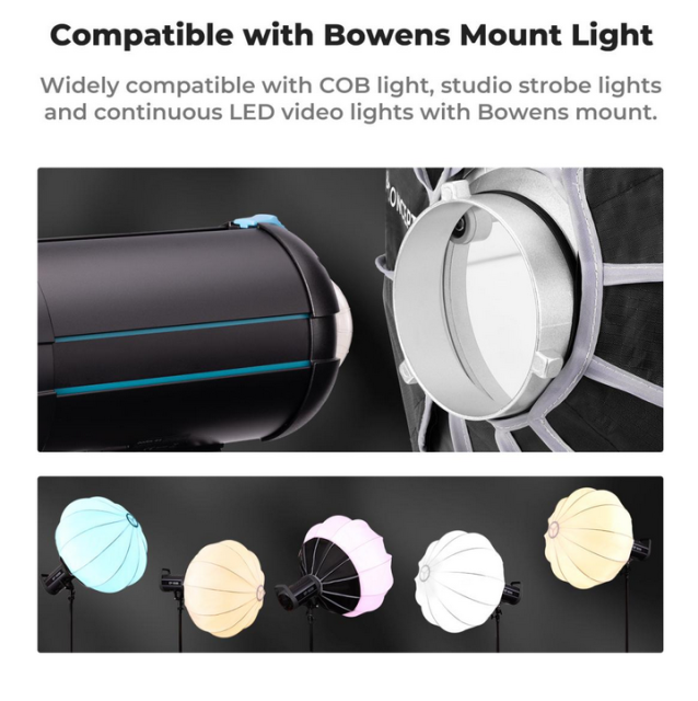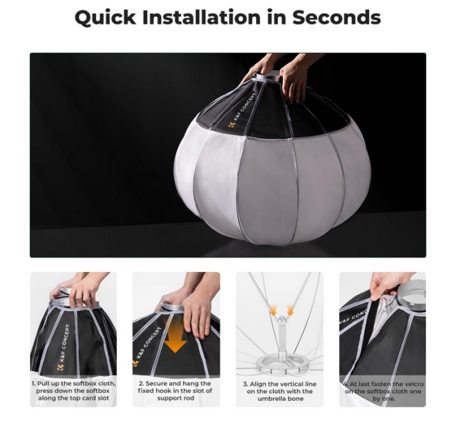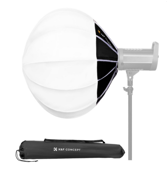 K&F 85CM Lantern Soft Light Box je zasnovan za fotografe in filmske ustvarjalce, ki potrebujejo vsestranske in učinkovite svetlobne rešitve. Njegova sferična oblika zagotavlja 360-stopinjsko vsesmerno mehko svetlobo, zaradi česar je idealen za studijsko uporabo, saj enakomerno širi svetlobo z 270-stopinjskim kotom snopa. Ta lampijonski softbox je idealen za ustvarjanje mehke, enakomerne osvetlitve na širokem območju z enim samim virom svetlobe.