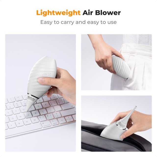 Napredni zračni pihalnik z dolgimi in kratkimi šobami, izdelan iz belega silikonskega materiala, namenjen čiščenju občutljive opreme. Oblika se lahko nekoliko razlikuje, vendar izdelek ohranja enako funkcionalnost in videz v beli barvi.