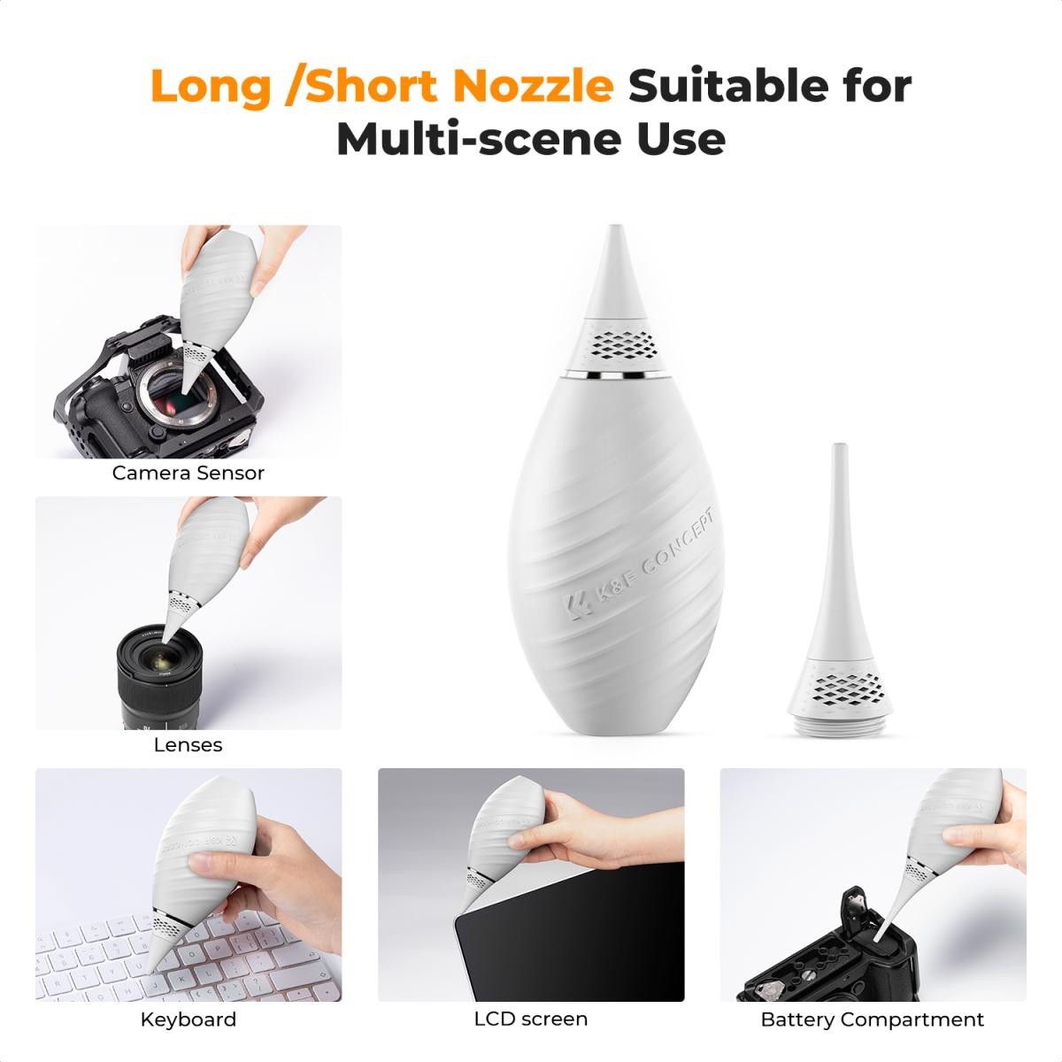 Napihoval nik K&F Advanced Air Blower je nepogrešljivo orodje za fotografe in videografe, ki je idealno za čiščenje objektivov fotoaparatov, senzorjev in druge občutljive opreme. Napihovalnik ima dolge in kratke šobe, ki omogočajo natančen in nadzorovan pretok zraka za odstranjevanje prahu in umazanije, ne da bi poškodovali opremo.