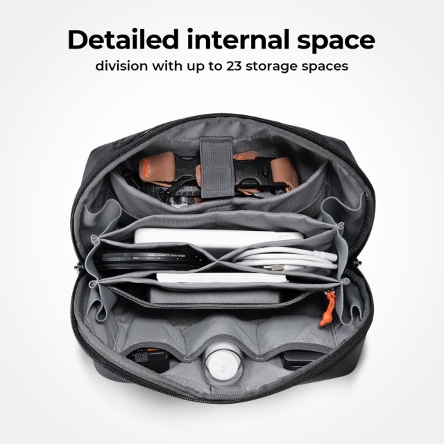 Lahka zasnova zasnove s podrobno razdelitvijo notranjega prostora in do 23 odlagalnimi mesti. V njem lahko elegantno in urejeno shranite mobilne telefone, polnilce, podatkovne kable, mobilno napajanje, ključke USB, miške, avtomobilske ključe, bančne kartice itd.
