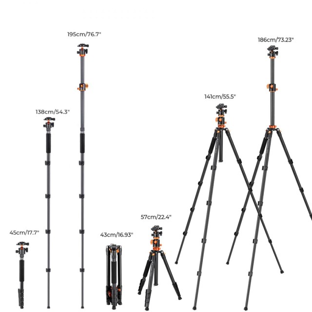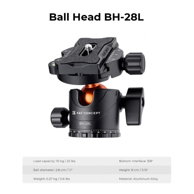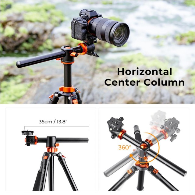 K&F T255A3+BH-28L je vsestranski aluminijasti stativ za fotoaparate s 360-stopinjskim vrtljivim prečnim sredinskim stebrom, snemljivim monopodom in 28 mm kroglično glavo, ki je idealen za panoramsko, makro in popotno fotografijo.