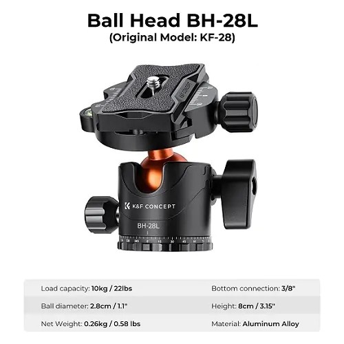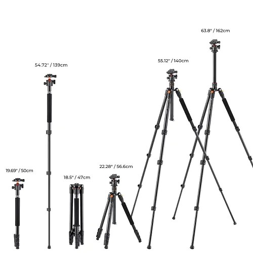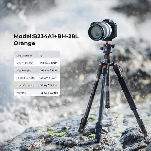 K&F Concept B234A1+BH-28L je robusten, a prenosni teleskopski stativ iz magnezijeve aluminijeve zlitine vojaške kakovosti, zasnovan za fotografe, ki zahtevajo trdnost, stabilnost in prilagodljivost. Opremljen je z visoko obremenljivo 28-milimetrsko kroglico in snemljivim monopodom, zato je idealen za potovalno, zunanjo, makro in portretno fotografijo.