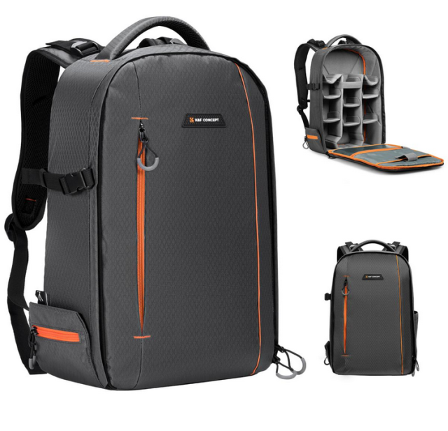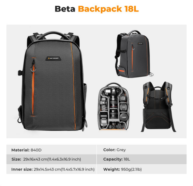 K&F Beta Backpack 18L v temno sivi barvi je lahka, prilagodljiva torba za fotoaparat, zasnovana za fotografe na poti, ki sprejme osnovno opremo in zagotavlja udobje med dolgimi snemanji.