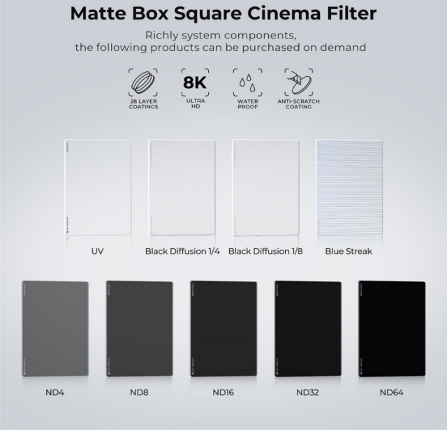 - Združljivost: Standardna velikost 4 "x5,65", ustreza večini matte boxov, vključno s Tilto in SmallRigom, kot nalašč za profesionalne kinematografske aplikacije.