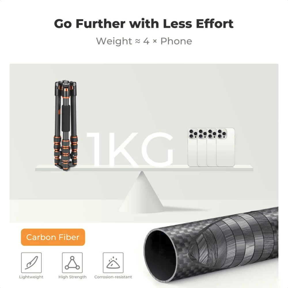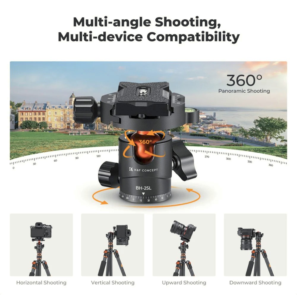 K&F Concept C225C0+BH-25 je vrhunski, ultralahki karbonski stativ z 25-milimetrsko kroglasto glavo in snemljivim monopodom. Zasnovan je za fotografe, ki potrebujejo prenosljivost, stabilnost in vsestranskost, odlikuje pa se pri potovalni, naravoslovni, makro in nizkokotni fotografiji.