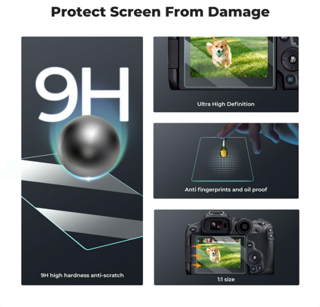 Komplet za zaščito zaslona fotoaparata K&F, ki je namenjen fotoaparatom Canon EOS R6 II, R6 in R7, vključuje 3 zaščite zaslona, 3 pokrove za vročo podstavno nogo in sesalno krpo za čiščenje. Ta komplet zagotavlja, da bo zaslon vašega fotoaparata ostal nedotaknjen z namestitvijo brez mehurčkov in visoko zaščito.