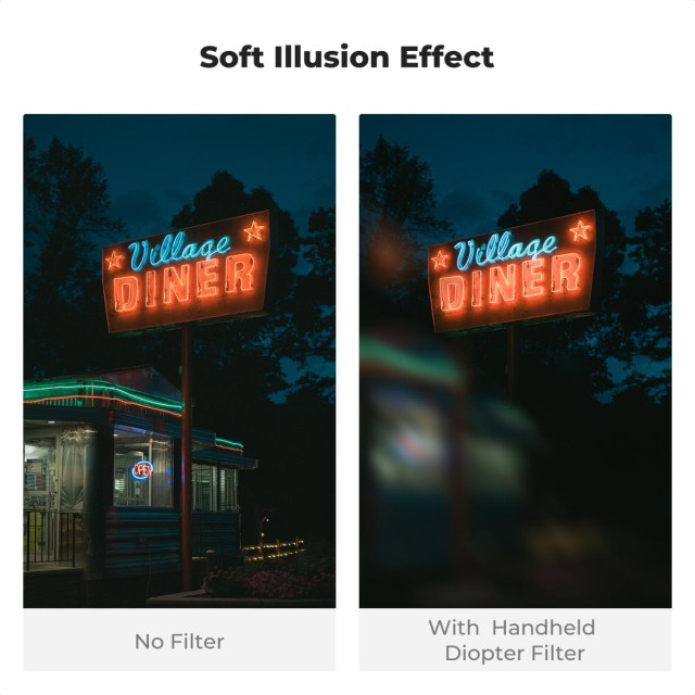 Ročni diopter lahko zamegli prednji plan fotografije in ustvari nove učinke. Poleg tega lahko poveča motiv, da doseže podoben učinek bližinskega posnetka. Idealno kot filter za posebne učinke za portretne in still-life fotografe, ki iščejo umetniško popačenje. Poleg mehkega fokusa ta ročni diopter tudi poveča motiv – simulira makro fotografijo za vsestransko uporabo pri kreativnem in profesionalnem fotografiranju.
