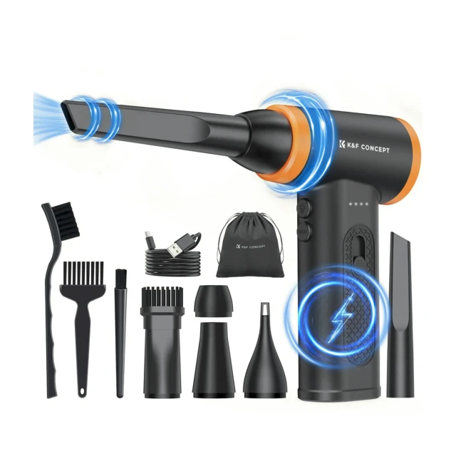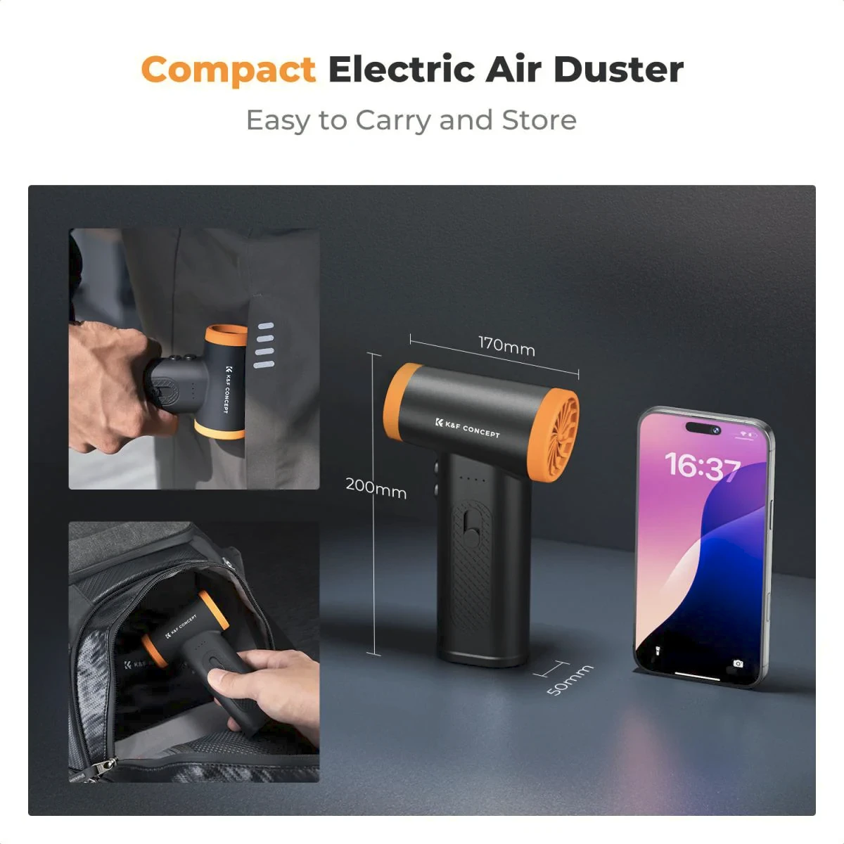 K&F Concept 12-v-1 brezkrtačni kompresorski prah je močno, okolju prijazno čistilno orodje, zasnovano za varno in učinkovito odstranjevanje prahu s fotoaparatov, objektivov, senzorjev, elektronike, tipkovnic in druge občutljive opreme. S trajnim brezkrtačnim motorjem, več nastavki za šobe in ponovno uporabno zasnovo nadomešča enkratne plinske bombice za dolgoročno in zanesljivo vzdrževanje.
