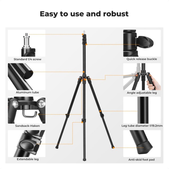 K&F CONCEPT 2 kos 2,0 m aluminijasti zložljivi stojala za luči z 1/4" vijaki in torbo – za video in studijske luči. Izdelana iz lahke aluminijeve zlitine, tehta le 870 g, zložena pa meri 43,2 × 9 cm – zlahka se prilega v nahrbtnike ali 20-palčne kovčke, kar je idealno za potovanja in snemanje na prostem.