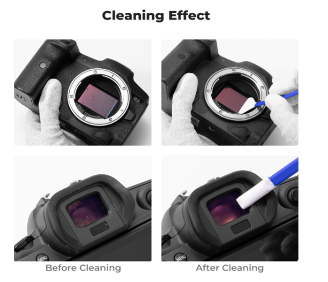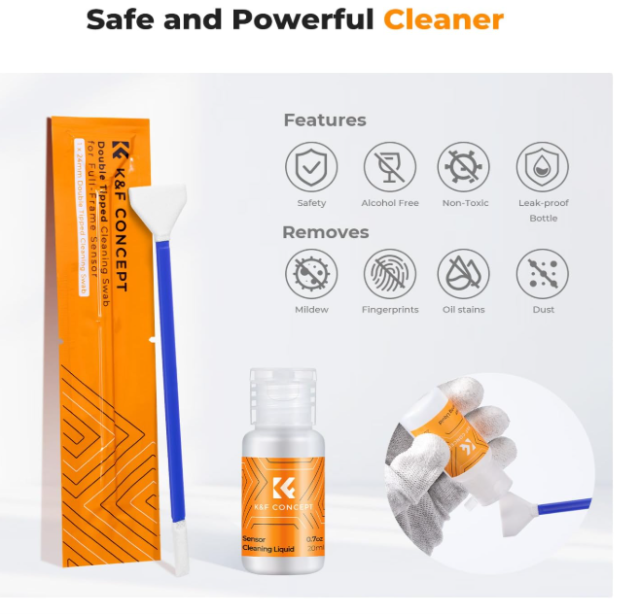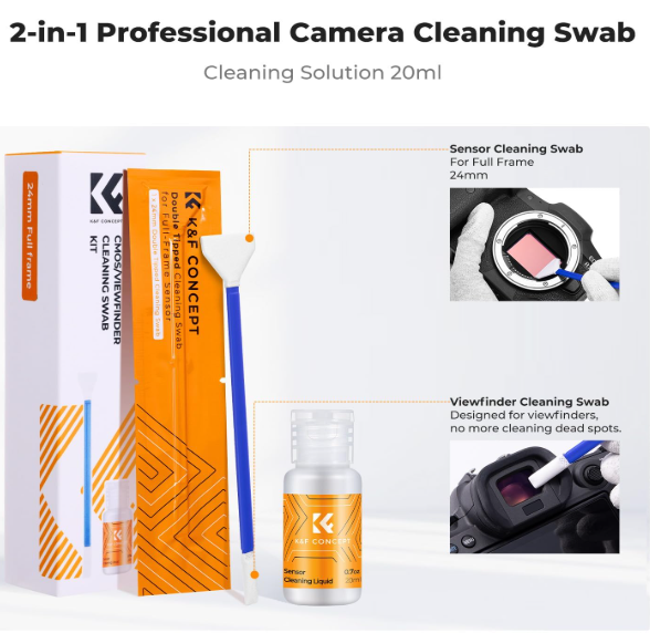 K&F Concept Full Frame Cleaning Kit je rešitev 2 v 1 za 24-milimetrske polnoformatne CMOS/CCD-senzorje in iskala, vključuje 5 mikrofibernih krp z dvojno funkcijo, 20 ml čistilne tekočine brez sledi in vakuumsko zaprto embalažo za uporabo brez prahu. Idealno za brezzrcalne/DSLR kamere, zagotavlja varno in natančno čiščenje leč, zaslonov in optike brez prask ali ostankov.