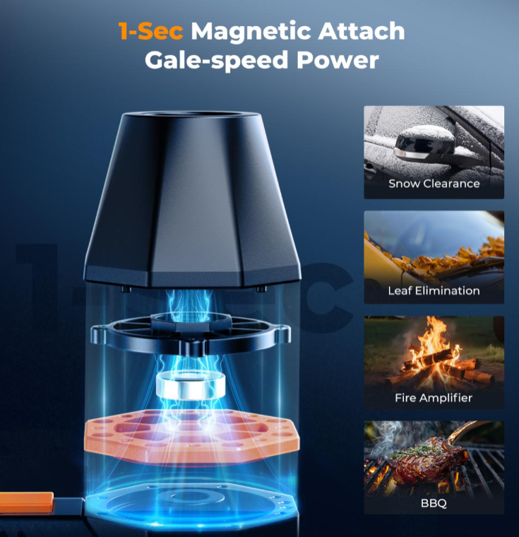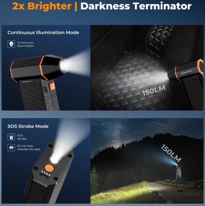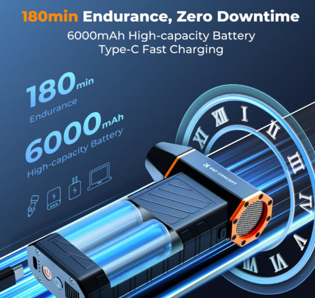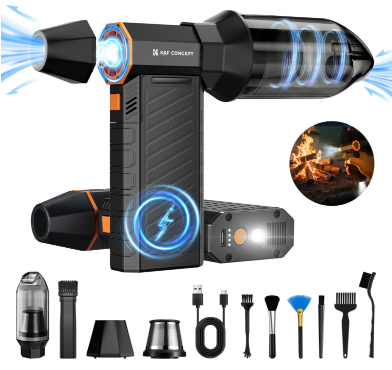 K&F Concept 2-v-1 magnetni kompresor za čiščenje s stisnjenim zrakom je naprava z brezkrtačnim motorjem (300.000 vrtljajev na minuto, hitrost vetra 150 m/s, sila 250 G), ki združuje močno pihanje, sesanje in LED-osvetlitev za čiščenje računalnikov, tipkovnic, avtomobilov in opreme za prosti čas. Z magnetnimi nastavki za šobe, 6 večfunkcijskimi krtačami, baterijo 6000 mAh (180 minut delovanja) in 3 načini delovanja ponuja vsestransko zmogljivost, zaščito pred pregrevanjem in prenosnost.