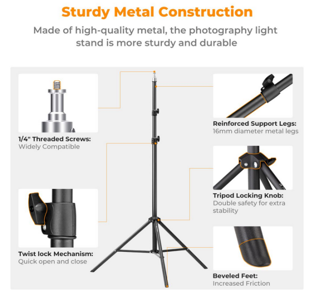 To stojalo za luči z nosilnostjo do 5 kg je združljivo s številnimi fotografskimi pripomočki, vključno z obročnimi lučmi, video lučmi, bliskavicami in drugimi. Vijak 1/4" na vrhu je mogoče nastaviti za 180 stopinj, da se prilagodi različnim kotom, zato je vsestransko uporaben za različne vrste osvetlitve in nastavitev fotoaparata.