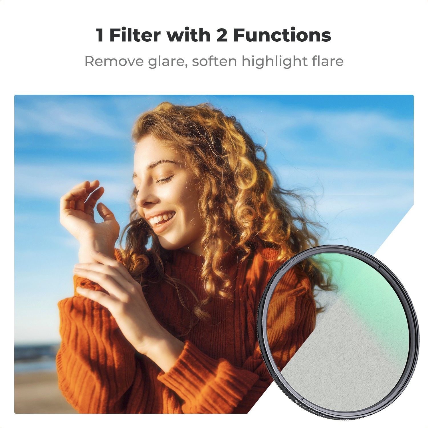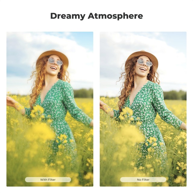 Difuzijski sloj Black Mist 1/4 nežno zmehča ostre svetlobne poudarke, zmanjša kontrast in izgladi teksturo kože, zaradi česar so poteze obraza videti bolj naravne in prijetne. Ustvari nežen sijaj okoli virov svetlobe, kar je idealno za portrete, modno fotografijo, kinematografske videe in nočne prizore. Hkrati vrtljivi CPL filter učinkovito zmanjša odsevanje vode, stekla in drugih nekovinskih površin, hkrati pa izboljša barvno nasičenost in kontrast.