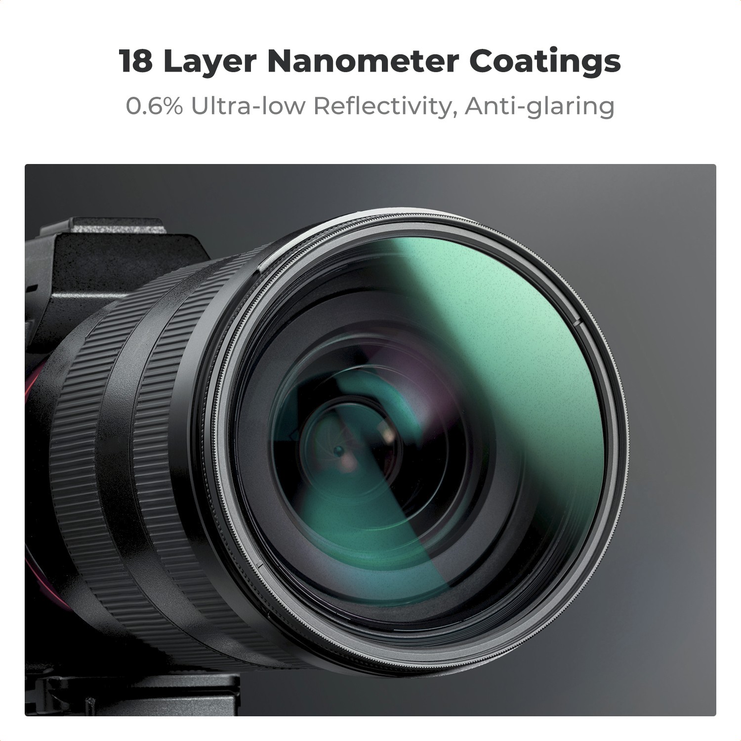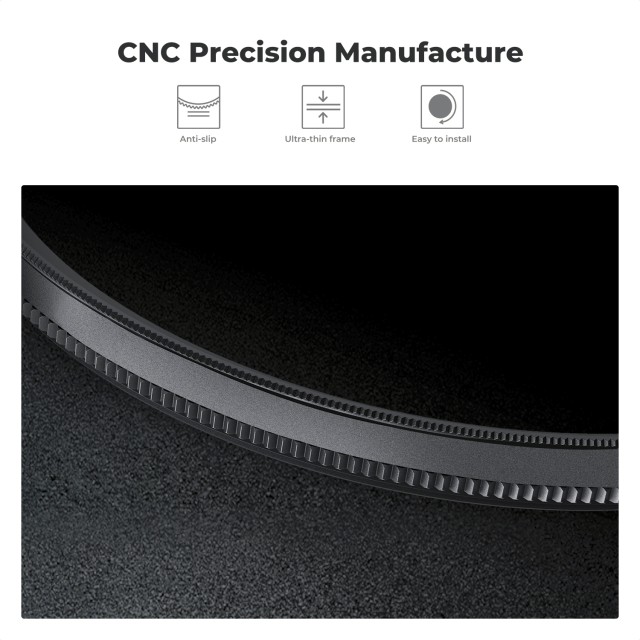 Filter je izdelan iz vrhunskega optičnega stekla AGC in ima 18 plasti naprednega večplastnega premaza, ki zmanjšuje bleščanje, podvajanje slike in odseve. Trajna nano-premaz zagotavlja odpornost proti zameglitvi, vodi, prahu in praskam za zanesljivo delovanje na prostem in v zahtevnih okoljih. Ultra tanek okvir iz letalskega aluminija zagotavlja združljivost s širokokotnimi objektivi brez vinjetiranja, medtem ko CNC-obdelan trapezni vzorec izboljša oprijem za enostavno namestitev in gladko nastavitev.