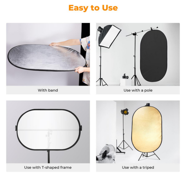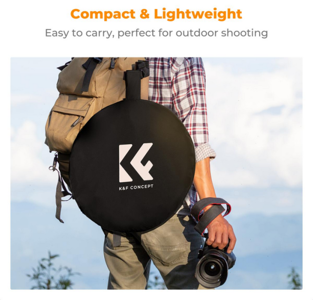 Ta reflektor se hitro zloži v kompaktno velikost, kar olajša shranjevanje in prenašanje, zlasti za fotografe, ki so vedno na poti. Za dodatno udobje mu je priložena torbica za prenašanje. Zlati in srebrni premazi reflektorja, izdelani iz visokokakovostne tkanine, so odporni na bledenje, gladka zadrga pa zagotavlja enostavno rokovanje.