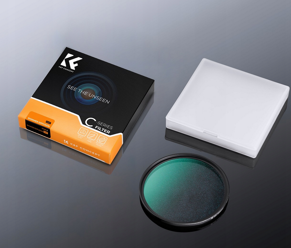 K&F Concept 52 mm C serija Microlight Mirror Shimmer difuzijski filter: HD steklo z NANO-C protirefleksnim premazom, tanek 3,3 mm aluminijast okvir za mehko, sanjsko razpršitev svetlobe in eterične bleščeče učinke.