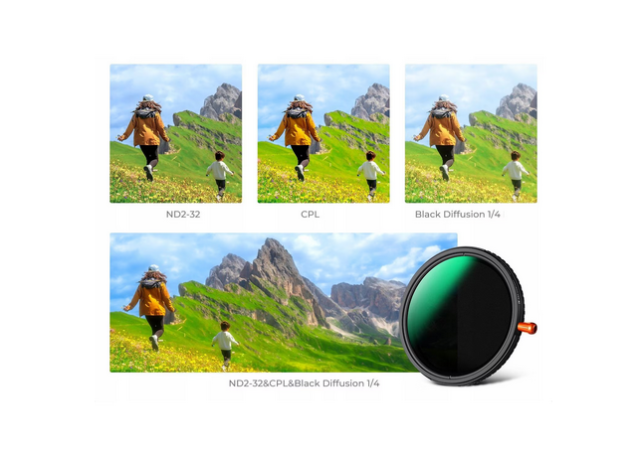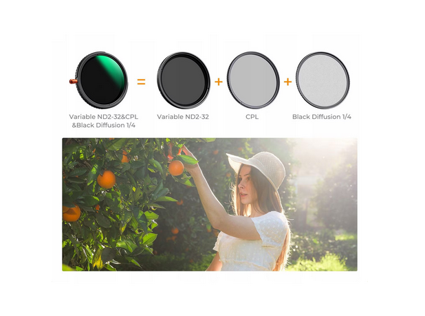 K&F Concept 55 mm NANO C Series 3-v-1 večfunkcijski filter je napredna hibridna rešitev, ki združuje tri bistvene filtre v enem kompaktnem, visoko zmogljivem orodju: spremenljivi ND2-32 za natančno nadzorovanje osvetlitve, polarizacijski filter CPL za bogate barve in odstranjevanje odbojev ter filter Black Diffusion 1/4 za mehko, kinematografsko upodabljanje. Ta filter je idealen tako za fotografijo kot za video, saj omogoča dolge osvetlitve, snemanje z majhno globinsko ostrino podnevi, izboljšano barvno nasičenost in lepo razpršene portrete – brez potrebe po nošenju več filtrov.