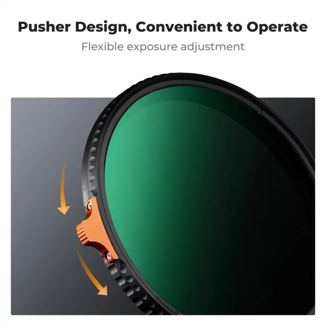 Z odbojnostjo le 0,15 % filter učinkovito preprečuje nastanek duhov in bleščanja, zlasti v scenarijih z osvetlitvijo od zadaj ali močno svetlobo, ter tako zagotavlja jasno kakovost slike. Narebričeni okvir je oblikovan kot potisni vzvod za natančno nastavitev. Vsaka stopnja od ND2 do ND400 je jasno označena, kar omogoča gladko vrtenje za 360°, idealno za fotografiranje in snemanje videa.