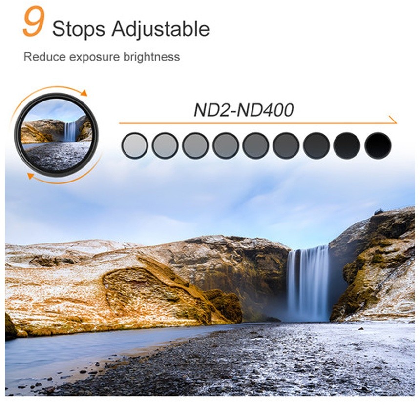 Filter K&F CONCEPT 58 mm True Color Variable ND2–ND400 je ultra tanek, visokokakovosten nevtralni filter, zasnovan za natančen nadzor fotografov nad osvetlitvijo. Izdelan je iz vrhunskega optičnega stekla in ima protirefleksijski premaz, ki zmanjšuje bleščanje in izboljša jasnost slike za osupljive rezultate.