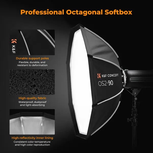 K&F CONCEPT 65 cm ravna osmerokotna softbox je visokokakovosten dodatni svetlobni pripomoček, zasnovan za fotografe in videografe, ki zahtevajo mehko, enakomerno osvetlitev s profesionalnim nadzorom. S premerom 65 cm (≈25,6 palca) dosega ravnovesje med velikostjo in prenosljivostjo – dovolj velik, da ustvari lepo mehko svetlobo, vendar dovolj kompakten za majhna studia ali snemanje na lokaciji. Zaradi univerzalnega Bowens S-Type nosilca je združljiv z široko paleto bliskavic in neprekinjenih LED-luči znanih blagovnih znamk, kot so Godox, Aputure, Amaran in druge.